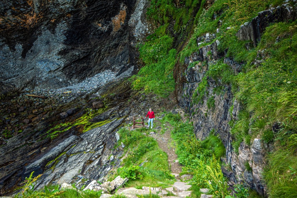 Our next stop along the way was the little known place of Whaligoe Steps. The steps had been used for years by fishermen to get to their fishing ships in the harbour, but more heroically I feel, is the story of the fishermen’s wives who would traipse up and down these 365 steps carrying all the fish, come rain or shine – and these steps were steep, narrow, slippery and downright treacherous!