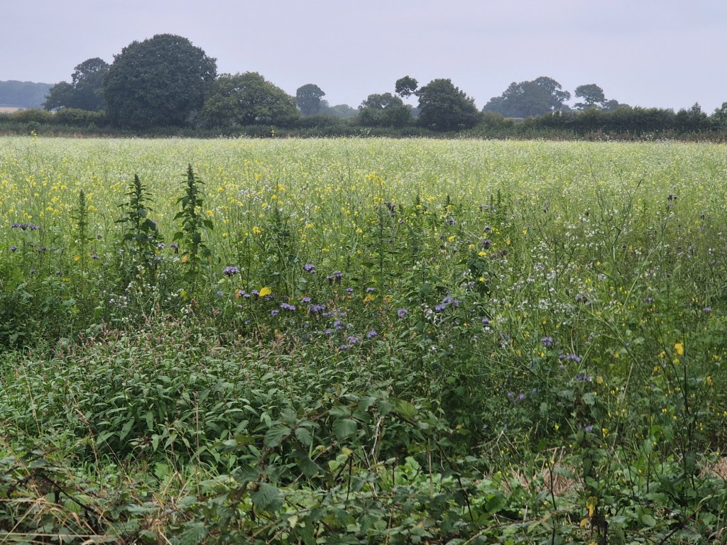 We walked through the farm yard, following the footpath signs which were now in abundance here, and back over the canal. From here we found ourselves heading up the side of a couple more fields, all with lovely, albeit grey, views over the Shropshire countryside. We walked past a beautiful meadow, left to grow with these stunning wild flowers, which I thought warranted a photo – you don’t see much of this these days, even though it’s highly encouraged!
