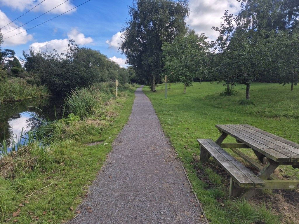 As i joined the towpath from the road, I saw what looked like a miniature canal, for want of a better description, that was working its way to the main section. It all looked so incredibly pretty. Here, a pedestrianised area had been created, complete with a bench, to enjoy the view. I walked a bit further down then looked back again – how beautiful is this?