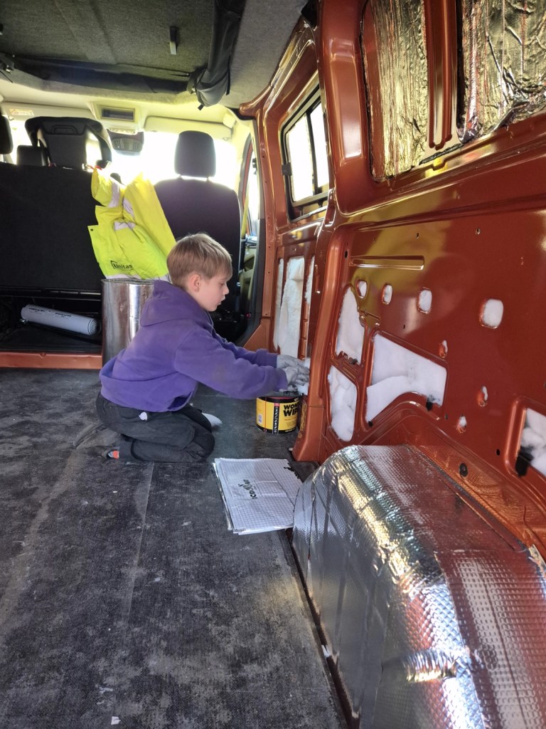Day 2 saw us moving on from the Sound Deadening to the insulation part of the kit from Combe Valley Campers. This was finally a job that the children could help with, and they couldn’t wait! The task here was simple, basically everywhere we had covered with sound deadening now needed to be covered with a sticky back 5mm foam (the one with a silver foil topper). Unlike the sound deadening, this wasn’t cut to a specific size: it was supplied on a roll! This meant that we were able to cut to suit the shapes and sizes we needed, and in many ways, this made it easier and quicker to fit. Or perhaps it’s because we had some extra hands helping us?