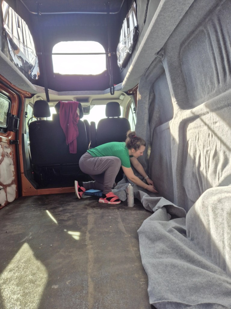 At first the carpet wouldn’t stick to the side of the van, and we were freaking out a little bit – then I took a good look at the carpet and, upon close inspection, realised that one side was a little fuzzier than the other! So if you’re planning to carpet your own van, take a good look – there was no information on the carpet and the one video I’d watched on YouTube hadn’t mentioned it either. In a previous life I’ve done boot builds, and that acoustic carpet was very much the same on each side 🙈