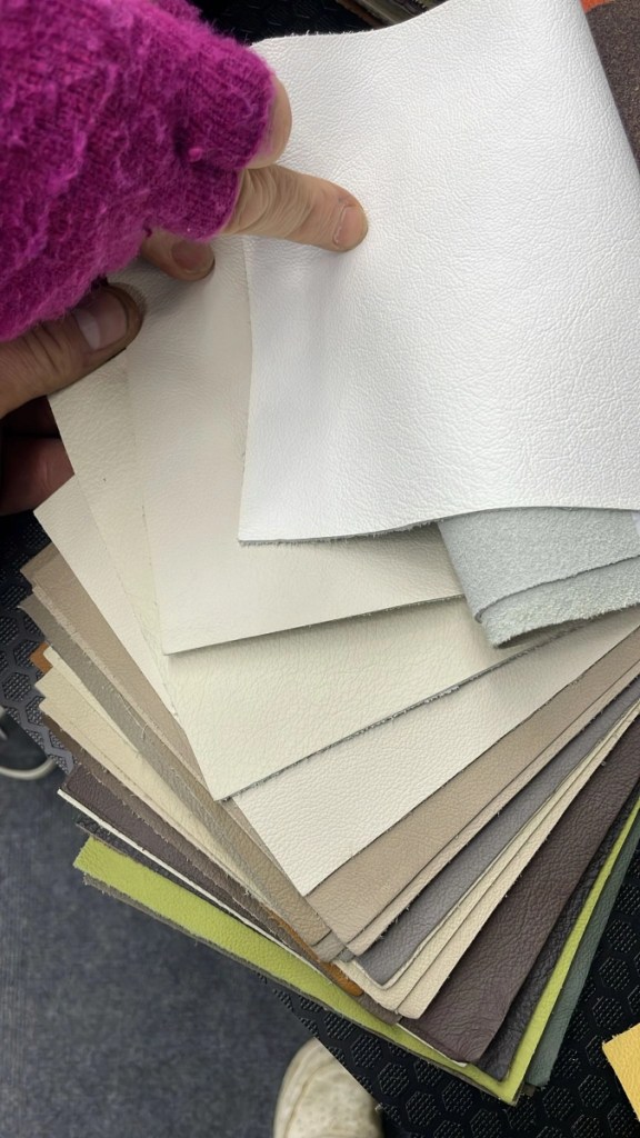 I discussed my plans with Vulcan Beds. I was after an ivory leather (I’d originally wanted white but my husband said white would be too stark and actually I thought he made a good point). I also wanted blue piping and stitching (I’m going for Ford Blue as my accent colour inside, as I couldn’t find any orange to match the exterior) and the Ford logo embroidered in the headrests. I also double checked that they could trim captain chairs too as, eventually, I would like to get a captains chair for the passenger side of the van so I can nip into the back without having to get out and run around 😂. Fortunately they can trim front seats too, so I’m on a mission to find a passenger side captains seat, but apparently I need to sell a kidney to afford this single style of seat 🥴.