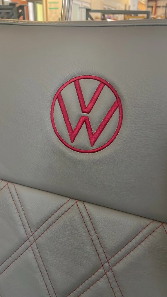 There was some issue in sourcing a Ford-blue-ish leather, but Vulcan were able to find another supplier to find something close. Then, around 3 weeks in, I did get another message to say that unfortunately their embroidery machines just couldn’t do their usual high quality finish on the Ford logo, with their suspision for the issue being placed firmly on the leather. I took a look at the photos they sent, and they were right, the quality was not up to the quality they have had with other logos on other leathers – see how the edges are smooth on the VW logo below, but for the Ford logo, it’s all jagged and not filled in nicely.