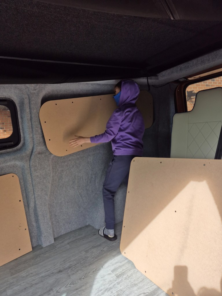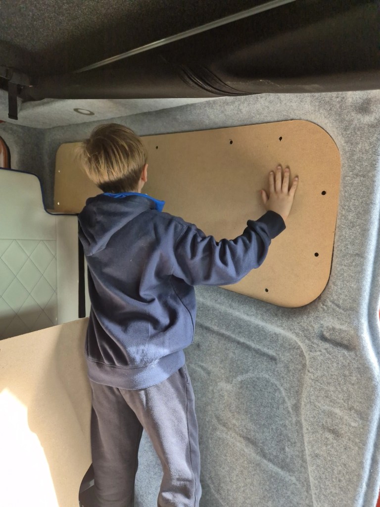 First task of the day was identifying which of the van’s original ply panels went where. Easier said than done – this was like van-life Tetris, but the boys were ready to accept the challenge! I left them to it, expecting minor chaos and at least one sulk, but to my genuine amazement they matched every panel to its place with zero arguments and actual teamwork. I’m still not sure what happened, but I didn’t question it.